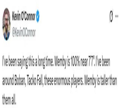 随后名记奥康纳转发社媒动态表示:“我早就说过这话!文班亚马绝对接近2米31,我亲眼见过博班、法尔这些巨人中锋,但文班站在他们面前时,他比所有人都高出一截!”