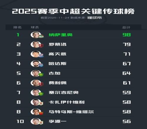 2025中超关键传球榜:纳萨里奥居首,本土球员高天意最多
