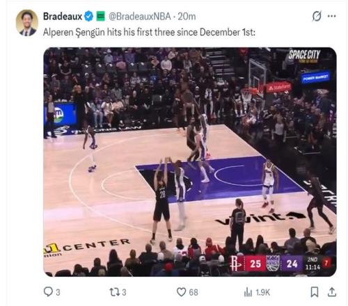 第三节申京第三次在篮下已经晃起了防守者但是没放进,感觉他还是不敢全力起跳,他更多还是以勾手的形式来得分,很明显脚踝并没有痊愈,申京两个三不沾非常尴尬,三节打完申京17中6拿14分6篮板3助攻2抢断,命中率35.3%。