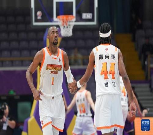 1月15日,江苏肯帝亚队球员贾尔斯(左)与队友亨特在比赛中击掌。新华社记者 谢晗 摄